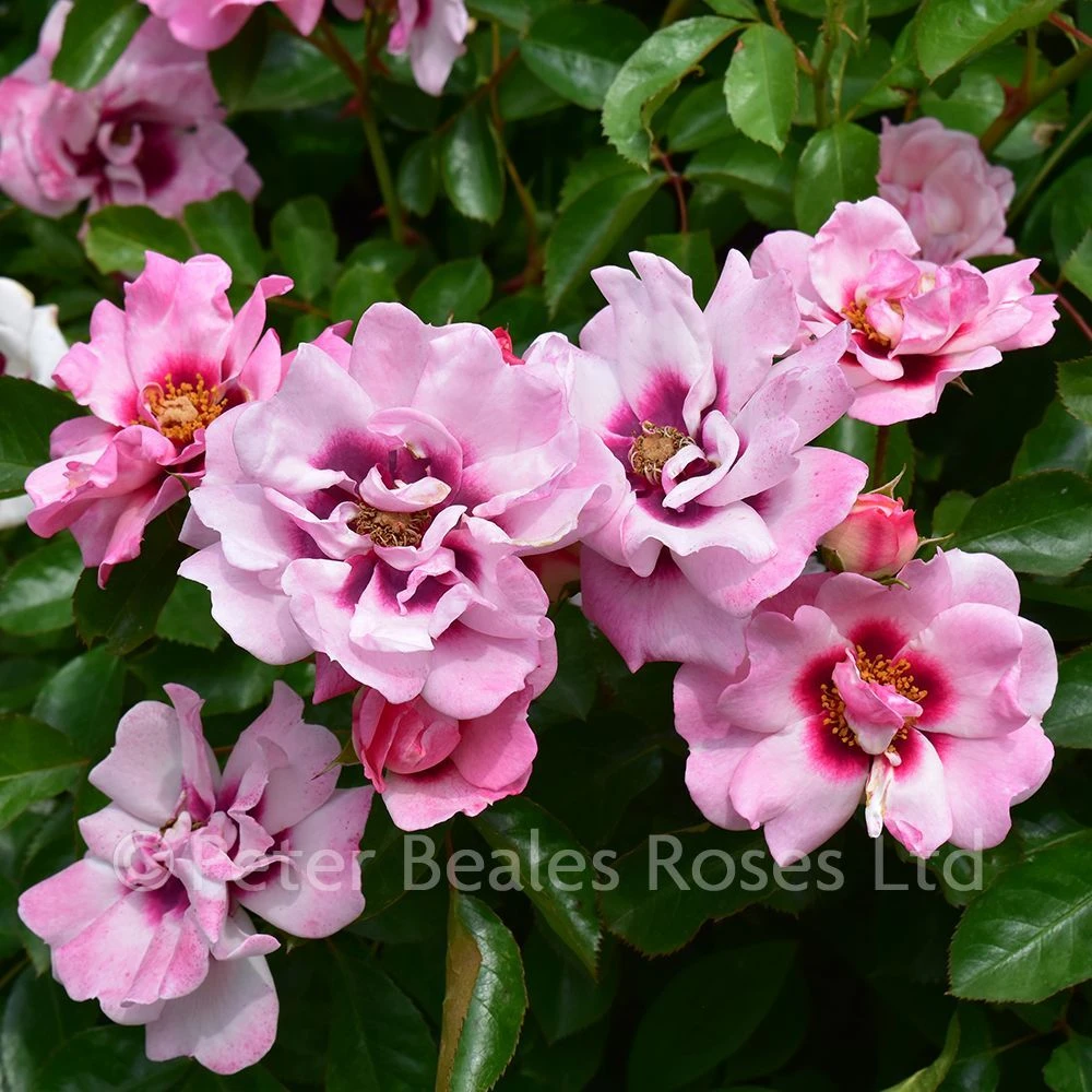 (Floribunda) Semi-double lilac/pink blooms with a magenta eye in the centre. Thorny. Hardy and tolerant of poorer soils. Perfect for tubs on the patio or could be grown as a hedge. Bred by Warner.