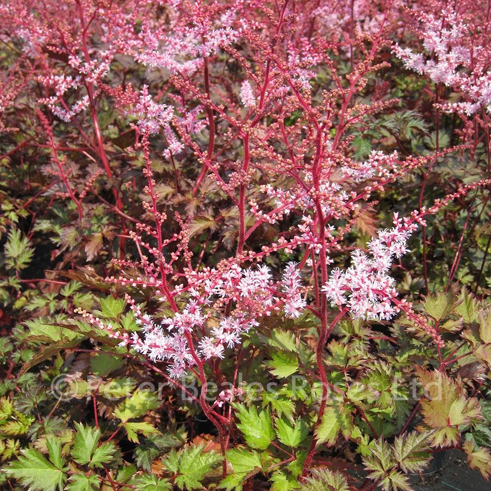 Very long plumes with salmon buds open to soft apricot pink on sturdy bright red stems above a mound of fern-like blue-green leaves. Thrives in rich, moist soil and continues to provide later interest as flower plumes turn to a rich caramel colour.