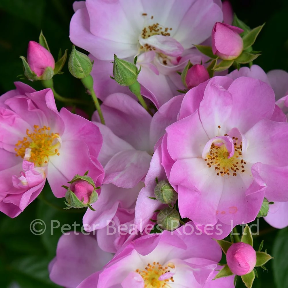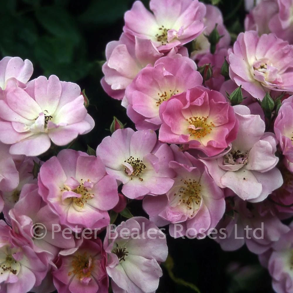 (Rambler) Abundant light green foliage on an almost thornless plant. Flowers soft blush-pink borne in cascading clusters.