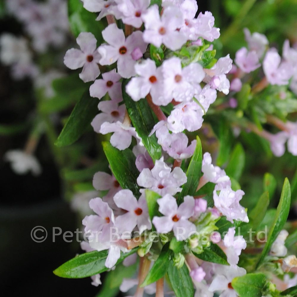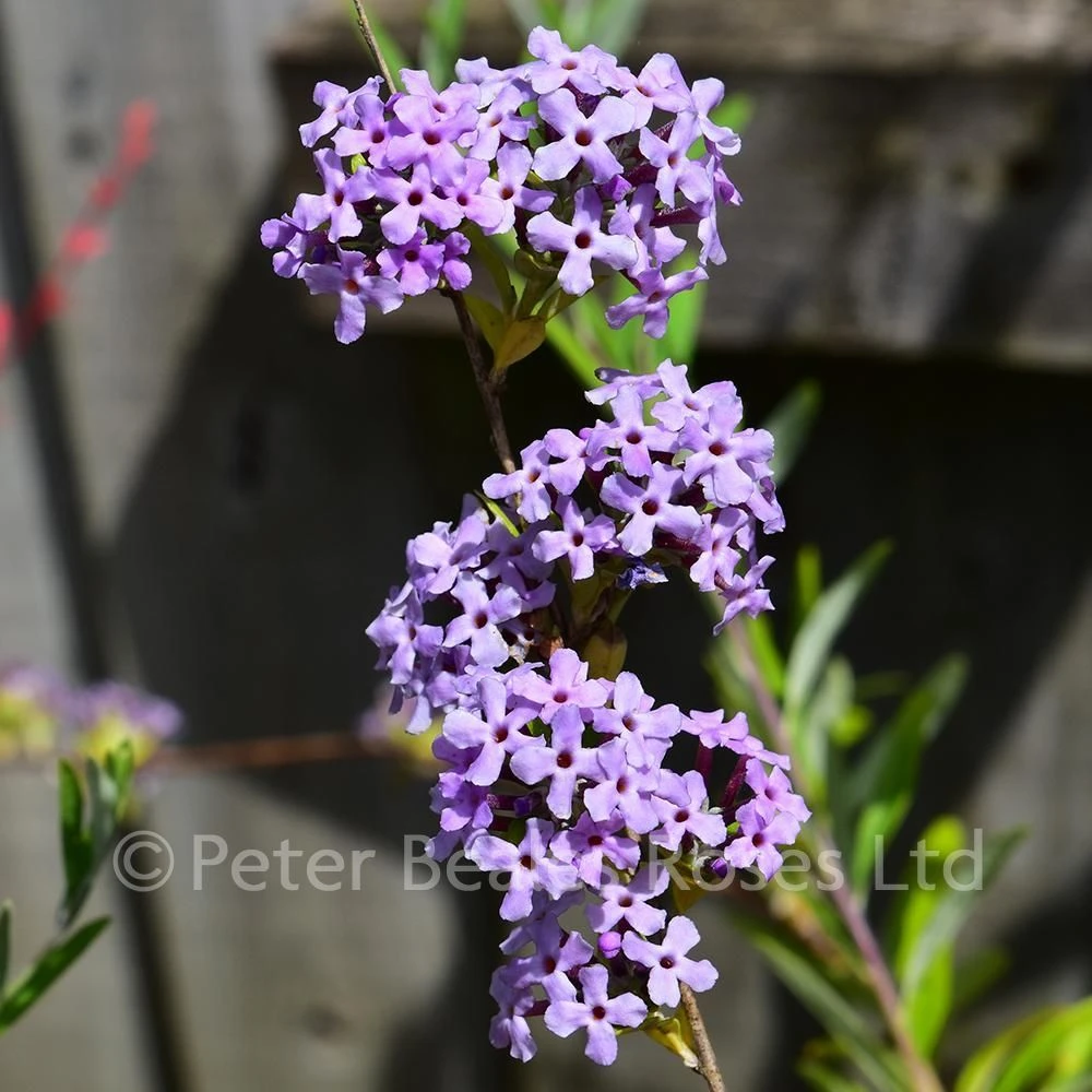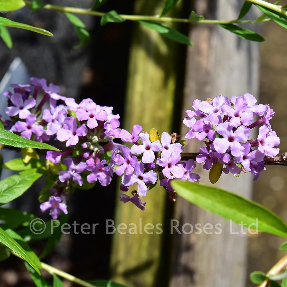 Deciduous, arching shrub with slender, pendant shoots and narrow, grey-green leaves. Neat clusters of fragrant, lilac-purple flowers in June to July. Ht.4mt.(14ft.). Can be trained as a weeping tree. Best in full sun and moist, well-drained soil.