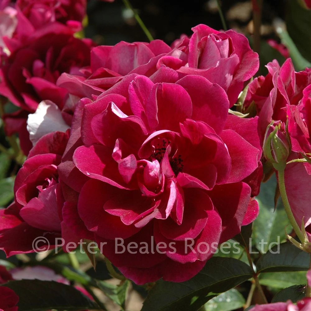 (Floribunda) ‘Burgundy Iceberg’. Scented, double flowers of striking, velvety, dark plum to purple, with long lasting displays. Light green glossy foliage. Hardy. Suitable to be planted into a container. Bred by Fryers.