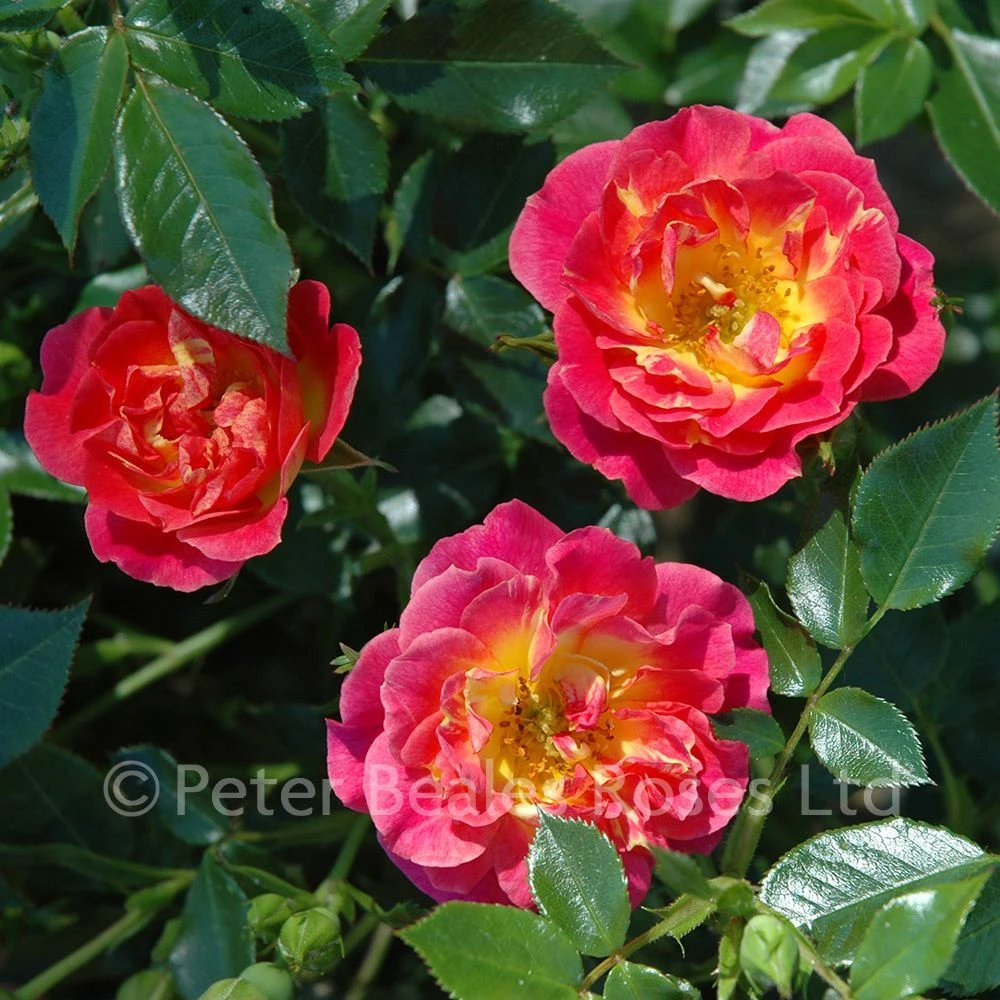 (Ground Covering Rose) Clusters of semi-double, flowers of gold cerise and pink. Glossy foliage. Suitable for planting in a pot, as a hedge, in poorer soils and in a shady area. Bred by Kordes.