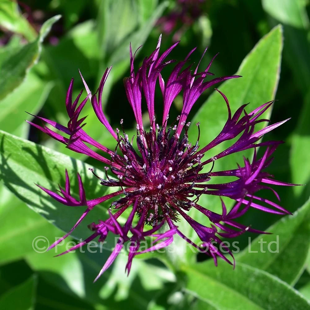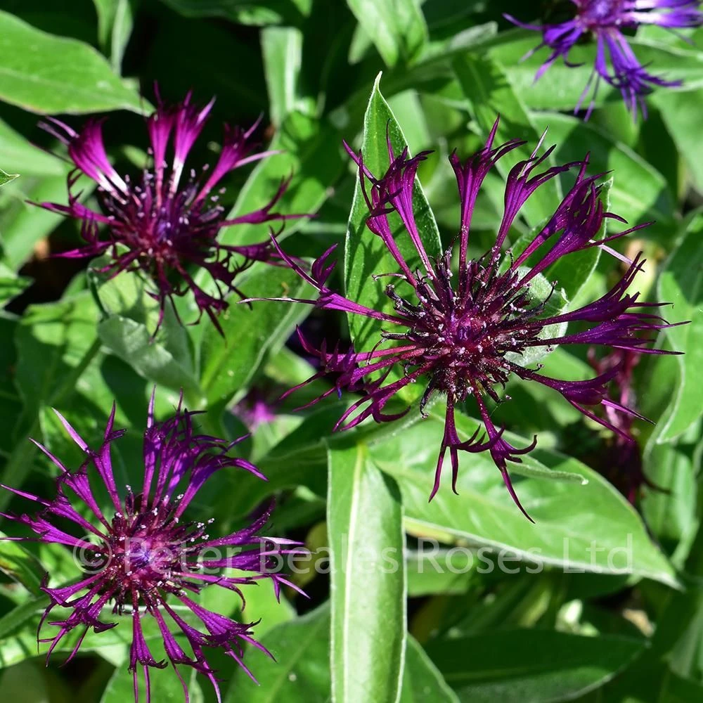 “Perennial Mountain Cornflower”. Silvery green leaves with rich purple flowers, thistle-like in appearance, attracting bees and butterflies. Perfect for a cottage garden and to add radiant colour to a border.