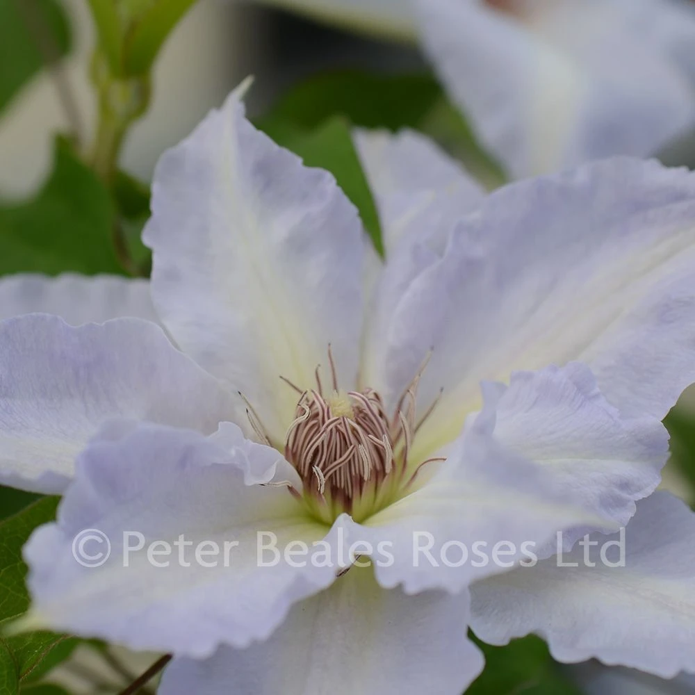 The beautiful star-shaped flowers are mauvy-blue with a white bar, they have crimped and wavy margins and a lovely crown of reddy-chocolate anthers. May to September. Hard prune. Any aspect.