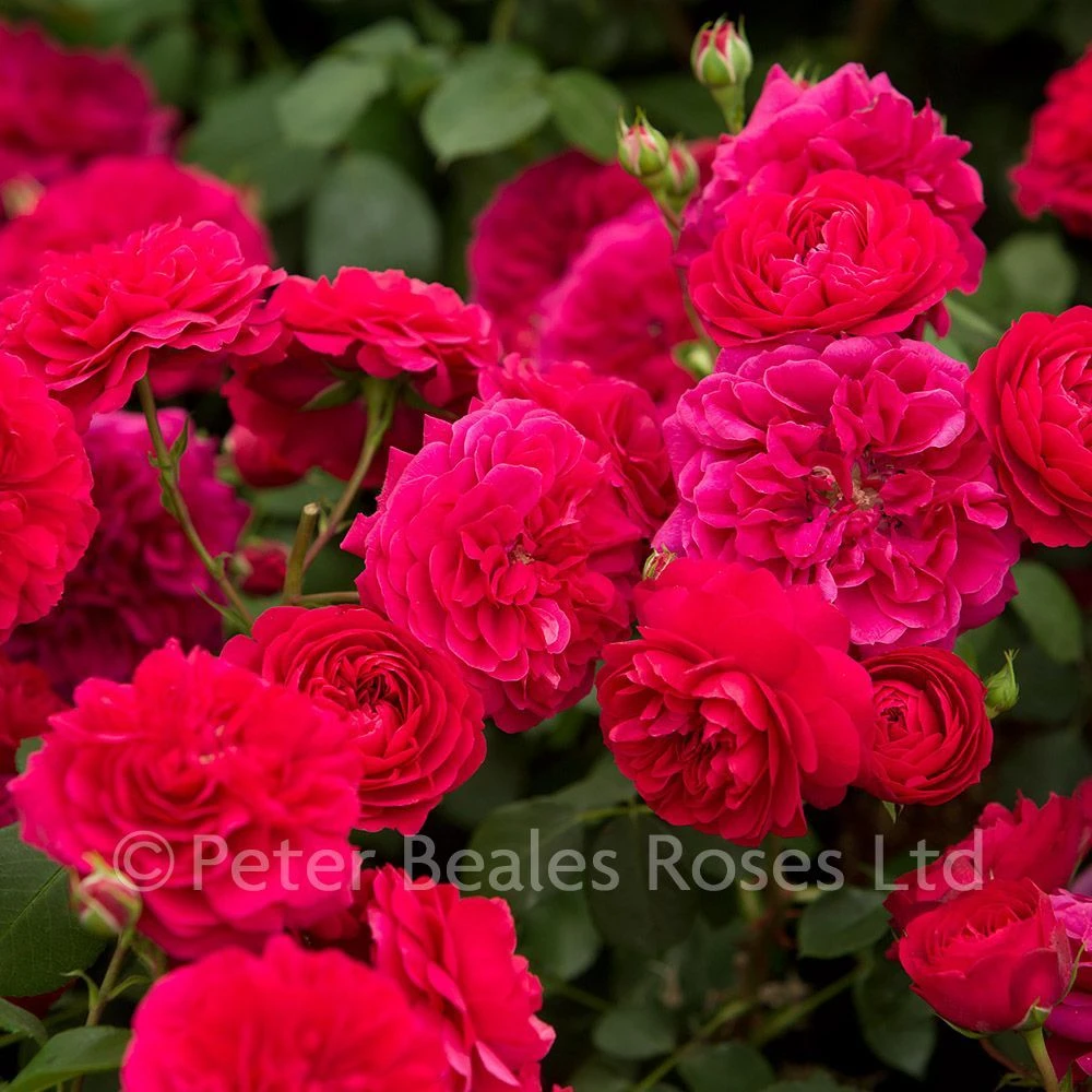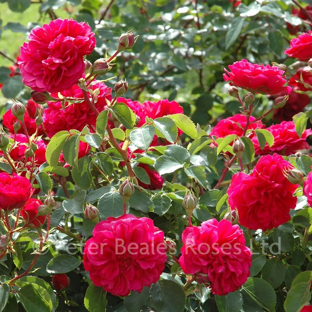 (Modern Classic) Producing a multitude of deep red buds, that once open form an array of exquisite fully double, frill-like deep cerise blooms with a delicate apple fragrance. The ample green flossy foliage is rudely healthy and is complemented with a sprinkling of thorns along the stems. The plant is bushy and healthy, and will grow to around 4 feet in height, is ideal for growing in a mixed border, as a specimen plant or if space is limited, within a pot or as a hedge. Bred by Beales.