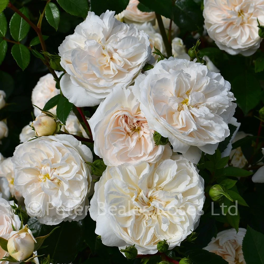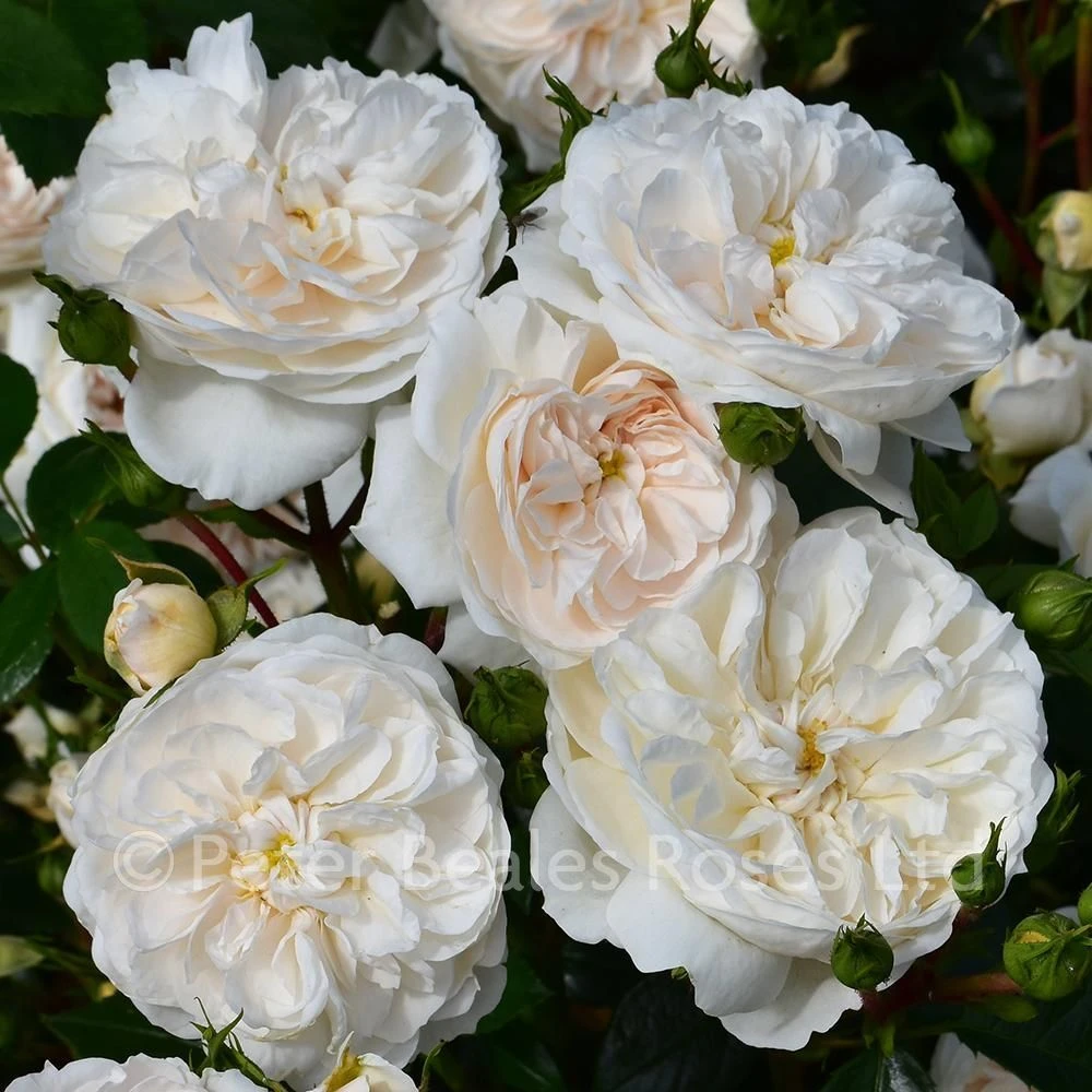 (Modern Classic) An excellent little shrub rose with large old-fashioned, rosette style blooms of white occasionally flushed peach, borne in clusters. They are subtly scented and prolific throughout the summer and autumn against dark green, glossy, foliage. Shade tolerant.