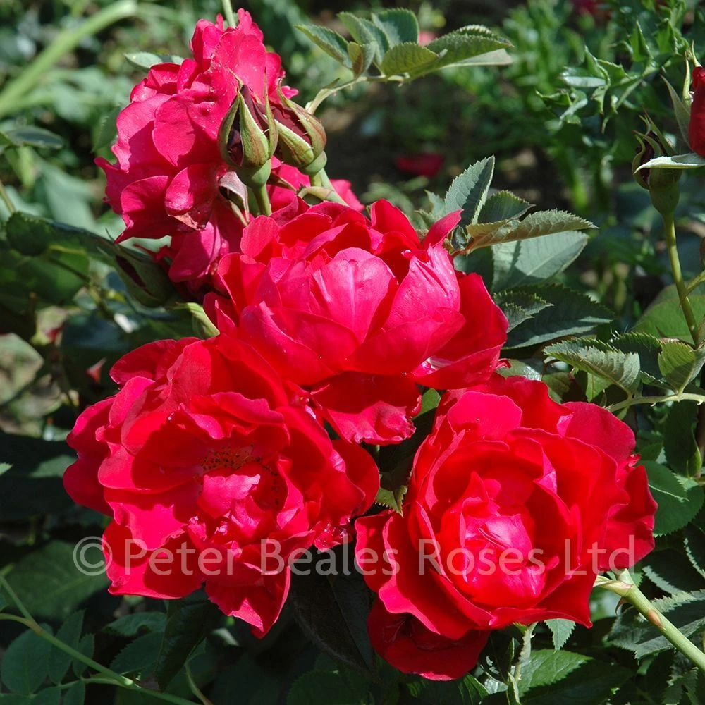 (Modern Classic Shrub) A medium sized shrub bearing clusters of large raspberry-red, intensely perfumed, peony style flowers, that unfold to reveal bright yellow anthers that are an absolute magnet to insects, with bright glossy mid-green foliage. Hardy and tolerant of shade. Looks magnificent planted en masse, in the middle of a herbaceous border or grown simply in a tub as a specimen plant to enhance a patio or paved area. Bred by Beales.
