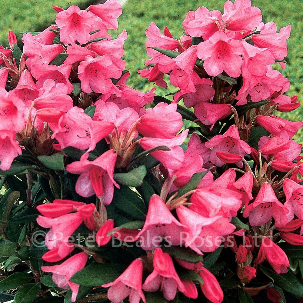 Bushy, evergreen with dark green leaves with rusty undersides. Young foliage is bronze. Salmon-pink flowers from April to May. Ht 150cm. Grow in moist, fertile well-drained acid soil. Good for containers or woodland borders.