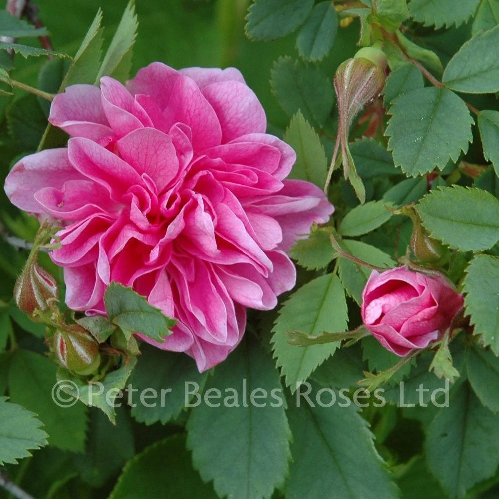 (Species) ‘Plena’. Rich lilac-pink, semi double flowers borne liberally on a gracefully arching bush in high summer. Small rounded orange-red hips in the autumn. Amply foliated with grey-green leaves. A very useful rose, ideal for hedging or in a woodland setting. Tolerant of poor soil and shade. Dated to 1894.